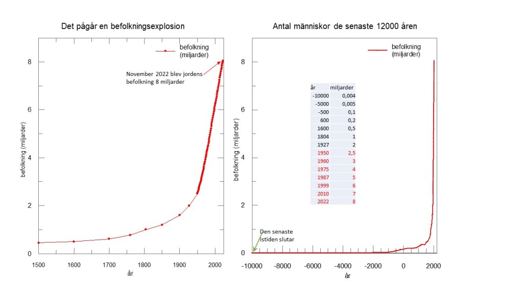 Jordens befolkning har blivit så stor att planetens förmåga att producera förnybara resurser inte längre räcker till. Vi har gått från 1,5 miljarder människor år 1900 till idag över 8 miljarder. https://www.worldometers.info/world-population/