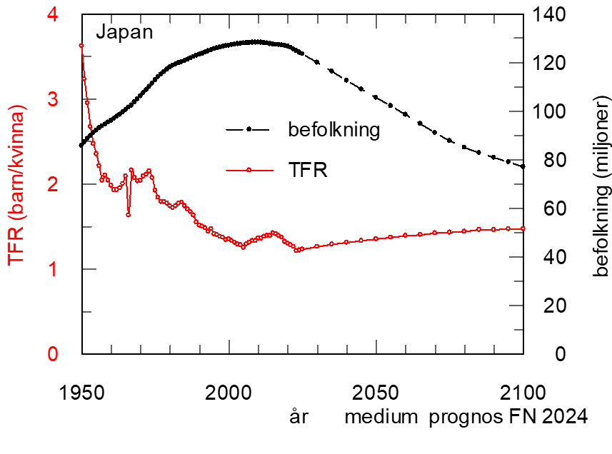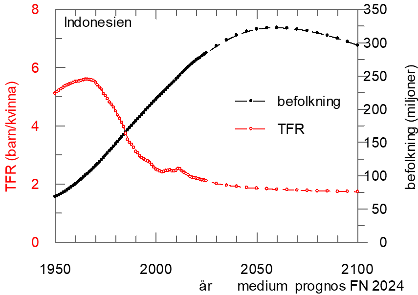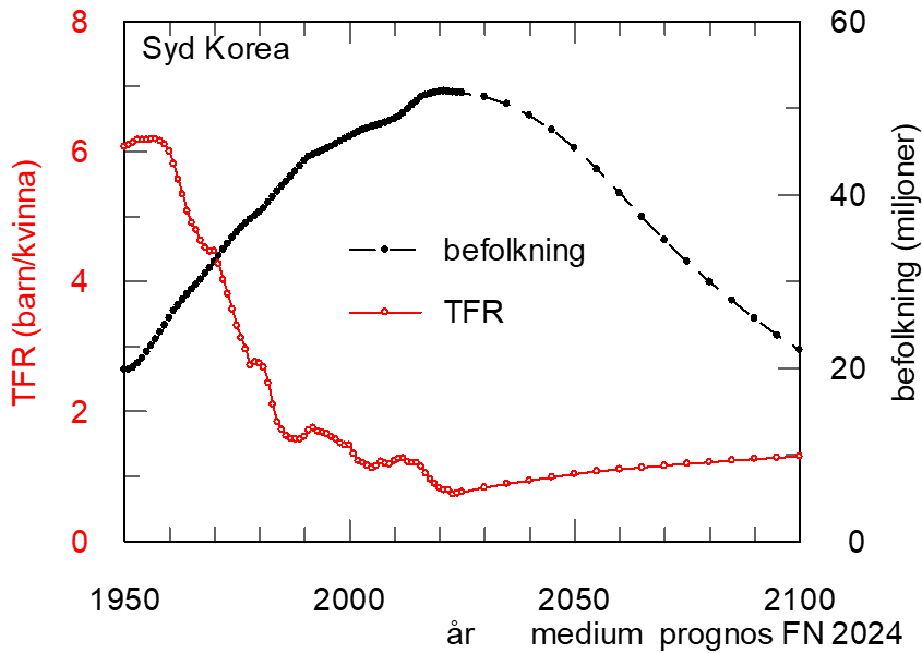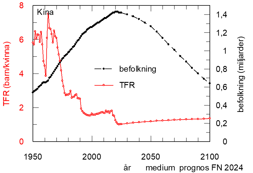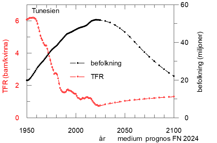 I graferna är symbolerna från 1950-2023 faktiska data medan de efter2023 är prognoser från FN baserade på ett medium läge. Landets befolkning (antal invånare): svarta symboler (höger axeln). TFR, Fertilitet (antal barn/kvinna i genomsnitt): röda symboler (vänster axeln).