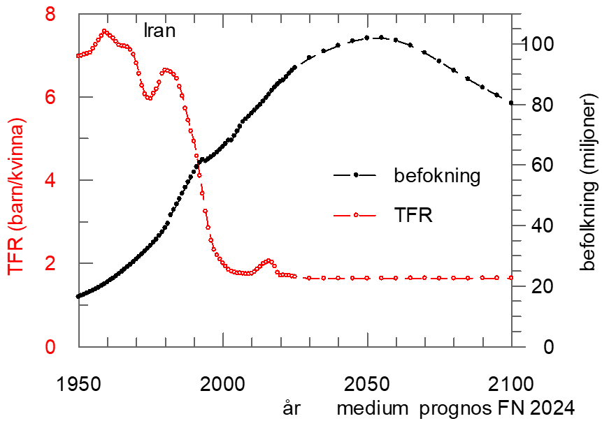 Iran lyckades genom sitt familjeplaneringsprogram att under perioden 1985 till 2015 minska antalet födda barn per kvinna från drygt 6 till knappt 2. Nuvarande styre har dock avskaffat programmet och blockerar möjligheterna till viktig reproduktiv hälsovård. Man har ersatt kampanjen ”2 barn räcker” med ”fler barn, ett lyckligare liv”. En lång tradition av familjeplanering och redan utbildade kvinnor och par kan dock göra att antalet födda barn per kvinna kan fortsätta att ligga på en låg nivå, åtminstone under den närmaste tiden. https://overpopulation-project.com/the-iranian-miracle-the-most-effective-family-planning-program-in-history/