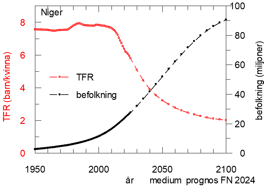 Tyvärr har många av de 42 länder i Sub-Sahara Afrika en lång väg att gå när det gäller att kunna få en lägre befolkningstillväxt. Ett skräck exempel av ett land i Sub-Sahara Afrika med den snabbaste befolkningsökningen är Niger. Dessutom, vilket gäller generellt, innebär det att om det finns många unga i befolkningspyramiden, som är fertila, att folkökning tar tid att stävja” (=population momentum). I grafen har FN utgått från en kommande ”lagom” minskning i fertiliteten.