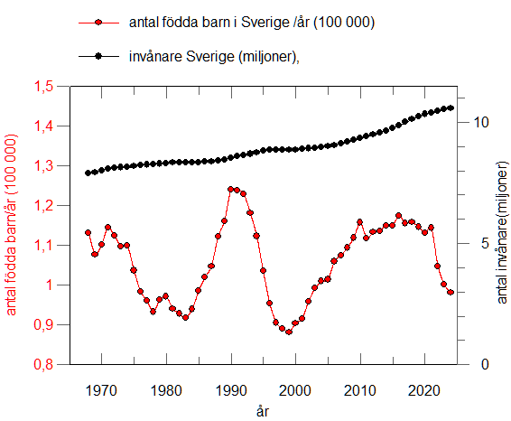 I genomsnitt har det i hela Sverige de sista 50 åren födds ca 107 000 barn per år, med en dipp omkring år 2000 när endast ca 88 000 barn föddes.
