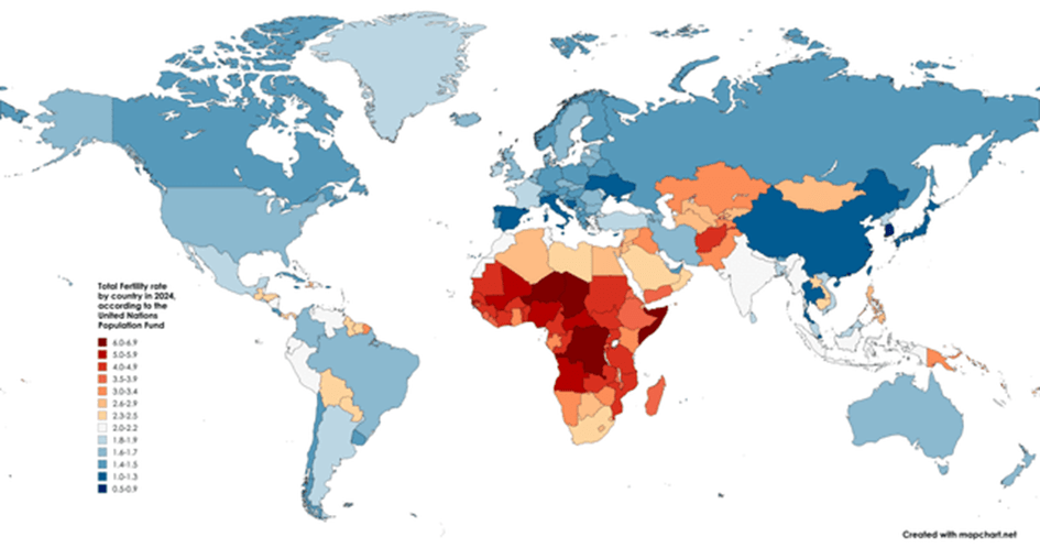 ”Fertility rate” dvs antal barn /kvinna i genomsnitt för 2024 återges på kartan för de olika länder på jorden och färgerna visar många område som inte är ”riktigt blåa” än.
