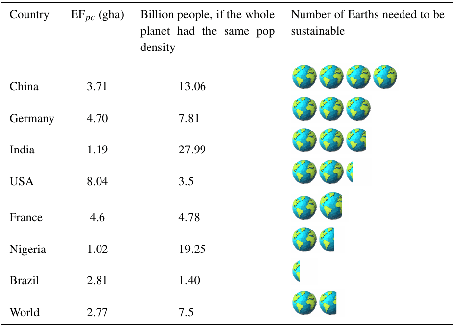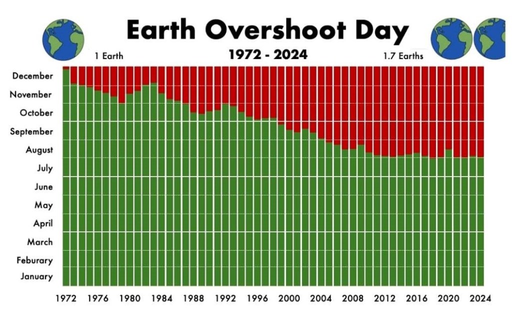 Sedan 1970-talet har mänskligheten årligen förbrukad mer resurser än vad Jorden kan återskapa varje år. År 2020 motsvarade det 1,75 jordar och därmed inföll Jordens Overshoot Day 2020 den 22 augusti, den för 2024 den 1:a augusti, den för 2025 den 24de juli. Människor använder lika mycket ekologiska resurser som om vi levde på 1,8 jordklot.